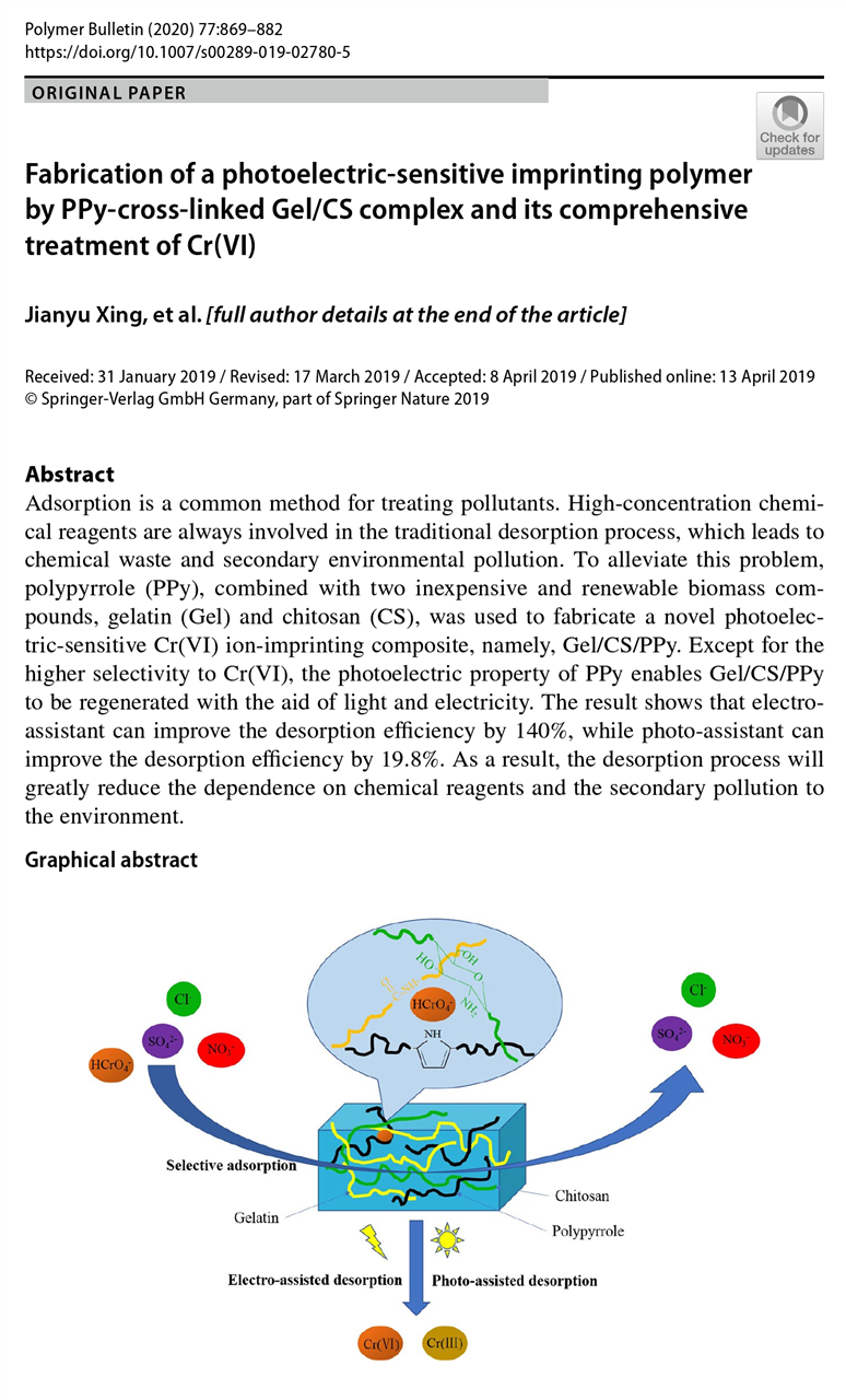 Technical articles高分子科学期刊《Polymer Bulletin》(IF=2.014)在线发表了长安大学环境科学与工程学院研究团队题为“Fabrication of a photoelectric‑sensitive imprinting polymer by PPy‑cross‑linked Gel/CS complex and its comprehensive treatment of Cr(VI)”的研究论文。