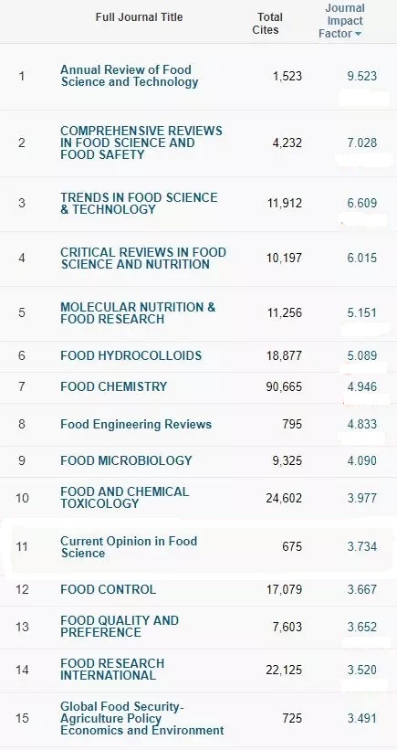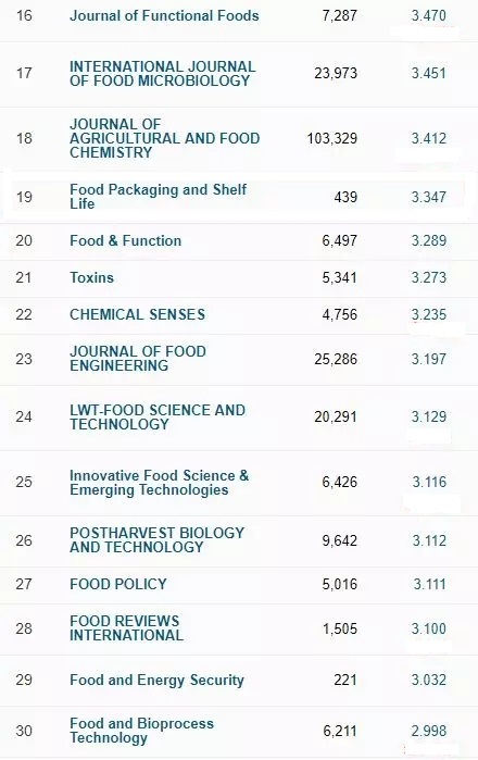 其中,食品科技类期刊2017年SCI影响因子排名如下: