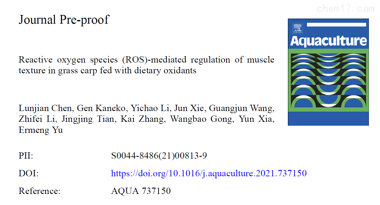 Technical articles近日,中国水产科学研究院珠江水产研究所在农林科学领域TOP期刊《Aquaculture》(IF=4.242)在线发表了题为“Reactive oxygen species (ROS)-mediated regulation of muscle texture in grass carp fed with dietary oxidants"的研究论文,在该研究论文中,研究人员利用上海腾拔Universal TA研究型质构仪测定草鱼的硬度、弹性、咀嚼性和粘附性等指标。这是上海腾拔质构仪助力珠江水产研究所在国际期刊《Aquaculture》、《Food Chemistry》和《Foods》发表论文后,再次助力珠江水产研究所在国际期刊《Aquaculture》发表论文。