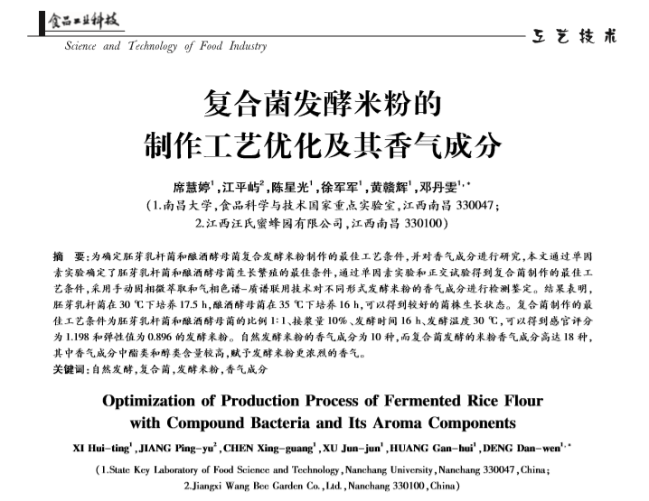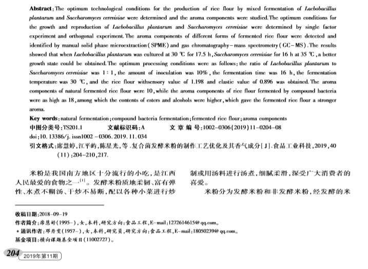 近期,南昌大学食品科学与技术国家重点实验室在《食品工业科技》期刊2019年第11期发表题为“复合菌发酵米粉的制作工艺优化及其香气成分”的文章,文章中使用Universal TA质构仪来测定米粉的弹性。