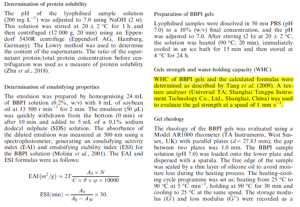 2020年,东北农业大学食品学院研究人员在食品期刊《International Journal of Food Science and Technology》(IF=2.773)在线发表了题为“Application of ultrasound treatment for modulating the structural, functional and rheological properties of black bean protein isolates”的研究论文。在本论文中,研究人员利用上海腾拔Universal TA研究型质构仪用于测定黑豆分离蛋白凝胶的凝胶强度。