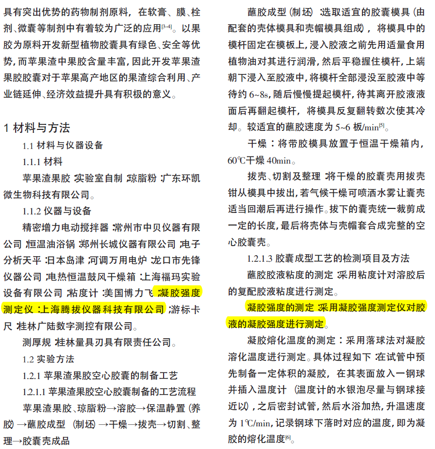 Data download2021年,三门峡职业技术学院研究人员在国内期刊《三门峡职业技术学院学报》在线发表了题为“苹果渣果胶胶囊的制备工艺研究”的研究文章。在该论文中,研究人员使用上海腾拔仪器科技有限公司的凝胶强度测定仪来测定胶液的凝胶强度。