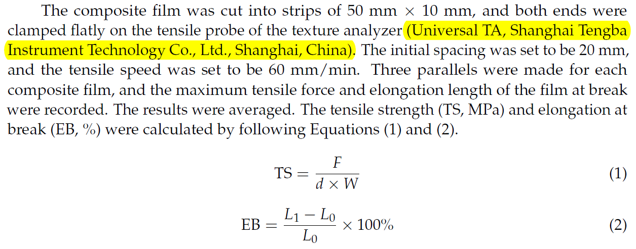 近日,山东大学海洋学院研究人员在国际食品期刊《Foods》(Q1,IF=5.561)发表了题为"Preparation and Properties of Blended Composite Film Manufactured Using Walnut-Peptide–Chitosan–Sodium Alginate"的研究论文。在该论文中,研究人员使用上海腾拔Universal TA研究型质构仪测定了复合可食用膜的拉伸强度和断裂伸长率。