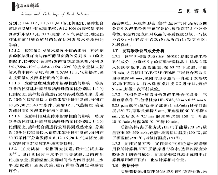 近期,南昌大学食品科学与技术国家重点实验室在《食品工业科技》期刊2019年第11期发表题为“复合菌发酵米粉的制作工艺优化及其香气成分”的文章,文章中使用Universal TA质构仪来测定米粉的弹性。