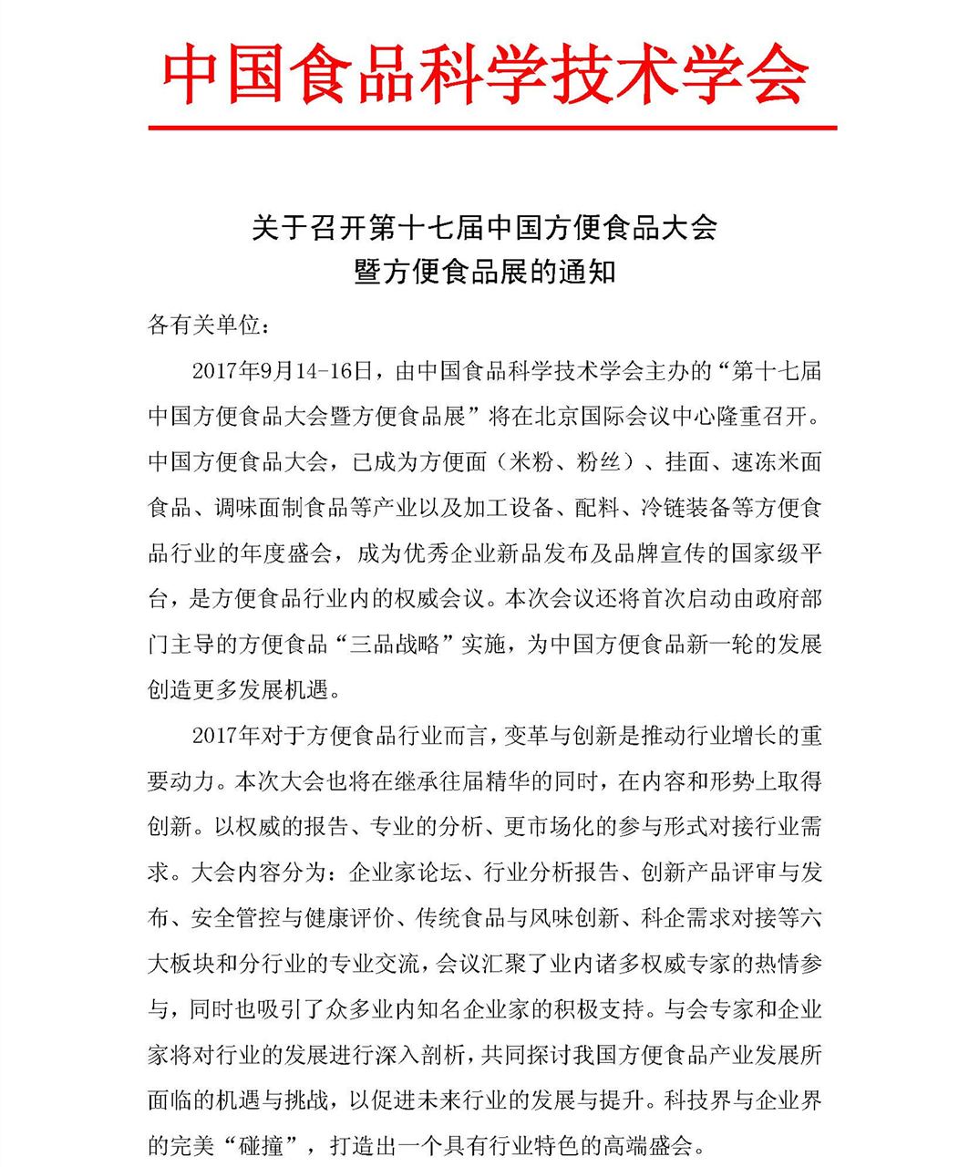 关于召开第十七届中国方便食品大会暨方便食品展的通知