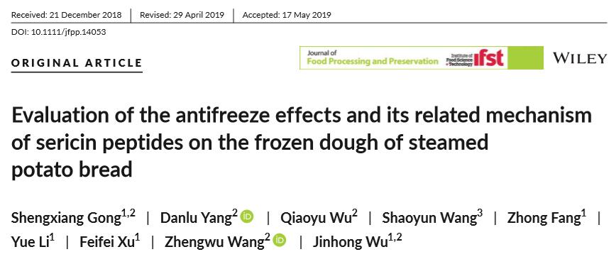 2019年5日,食品期刊《Journal of Food Processing and Preservation》(IF=1.288)在线发表了上海交通大学农业与生物学院研究团队题为“Evaluation of the antifreeze effects and its related mechanism of sericin peptides on the frozen dough of steamed potato bread”的研究论文。