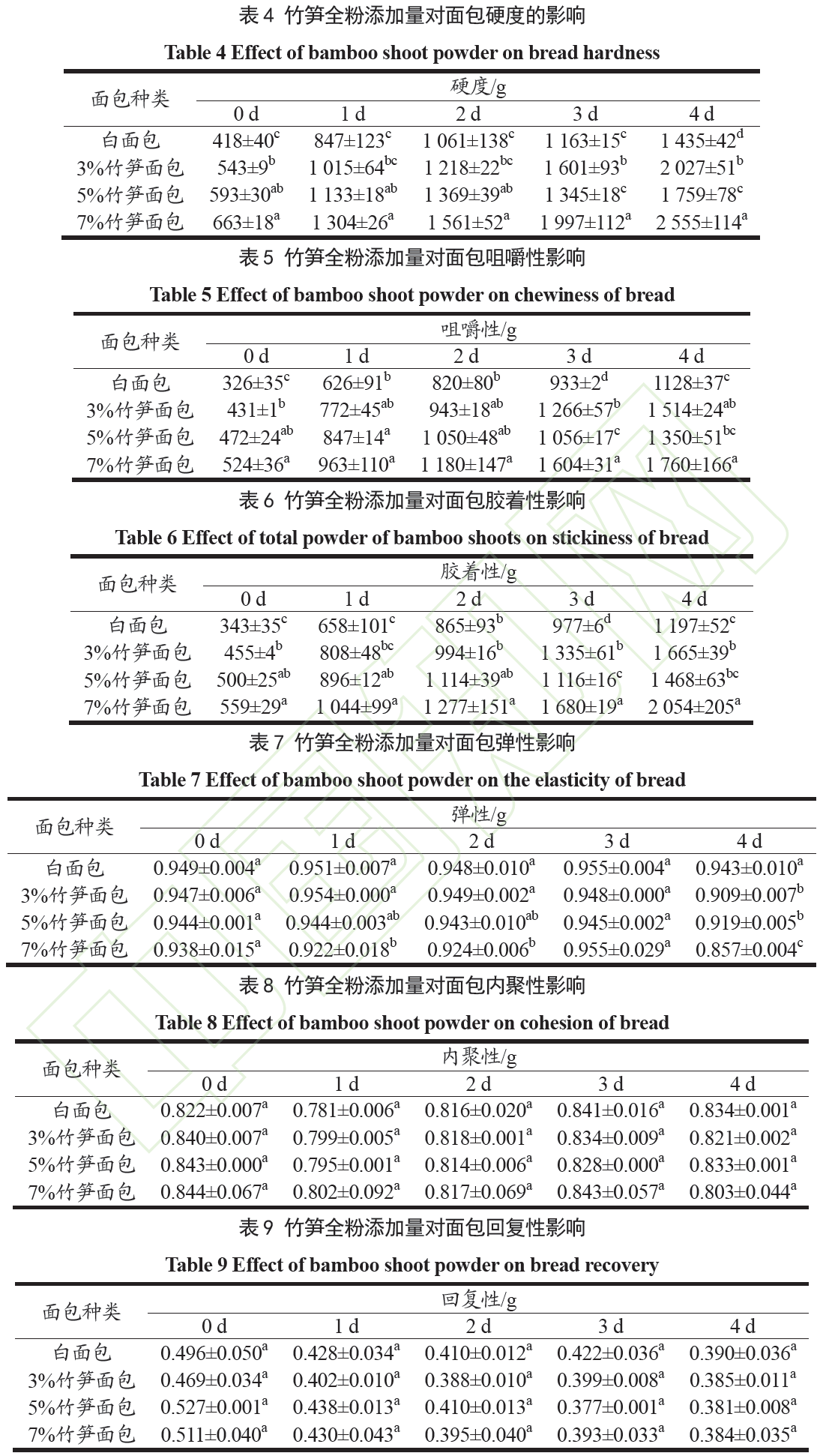 面包硬度是评价面包品质好坏的重要指标,也是面包老化程度的一个重要标志,硬度的数值变化越大,面包老化的程度越快。从表4 中可以看出:烘烤后添加竹笋后面包硬度增加,添加量越大,硬度越大。硬度的增大与前面竹笋粉的添加降低了混合粉面筋蛋白的含量有关,竹笋粉加入阻滞面筋蛋白网络结构的形成,导致面团的延伸性降低,不利于面团的蓬松,导致硬度增加。Arı Akın 等发现茶纤维加入面团,降低了面团的延展性、膨胀指数,增加了面团硬度。当面包放置1 天后,白面包、3%竹笋全粉面包、5%竹笋全粉面包、7%竹笋全粉面包硬度分别增加了了102.44%、86.88%、90.97%、96.67%。据分析,添加了竹笋全粉后,由贮藏导致的面包硬度增加的幅度均有不同程度的下降;当面包放置2 天后,面包硬度分别变化为153.62%、124.33%、130.84%、135.52%,相比于放置一天的面包硬度分别增加幅度为51.18%、37.45%、39.87%、38.85%,添加了竹笋全粉面包的硬度变化相对于白面包更小,差异显著(P<0.05),因此,竹笋全粉添加到面包中有助于减缓面包的硬度,进而防止老化。
