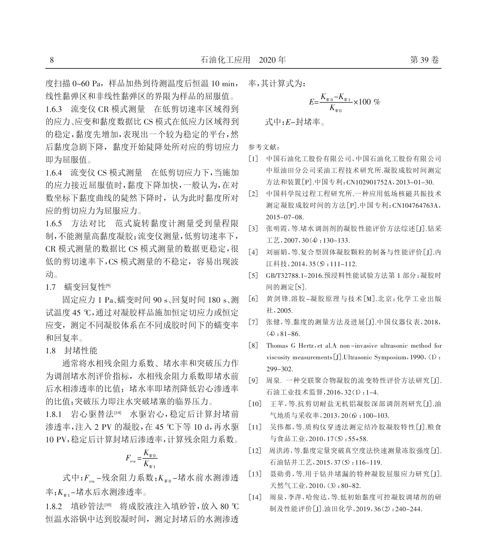 凝胶是线性聚合物在交联剂作用下,形成空间网状结构,结构空隙中充满了作为分散介质的液体,这种分散体系称作凝胶。凝胶是目前常用的封堵材料,一般凝胶性能从成胶时间、黏度、黏弹性、抗剪切性能、强度、屈服应力、蠕变回复性和封堵性能进行评价。关于凝胶性能测定一直没有统一的标准,本文总结对比了目前主要的凝胶性能测定方法。